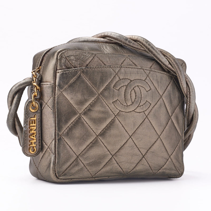 Sac bandoulière d'occasion, matelassé, Coco Mark, cuir d'agneau, argent-doré, finitions dorées, d'occasion