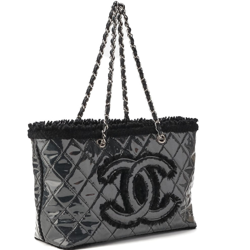 Sac bandoulière d'occasion, matelassé, double chaîne, vinyle de coton, noir, accessoires argentés, d'occasion