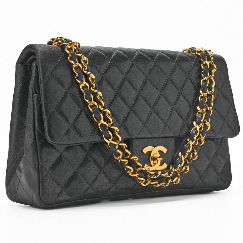 Sac bandoulière chaîne matelassé d'occasion, double rabat, cuir d'agneau, couleur or, accessoires dorés. D'occasion
