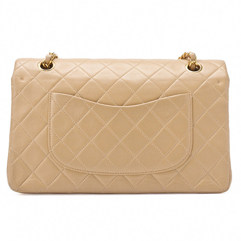 Sac bandoulière matelassé d'occasion à double rabat en cuir d'agneau beige et finitions dorées.