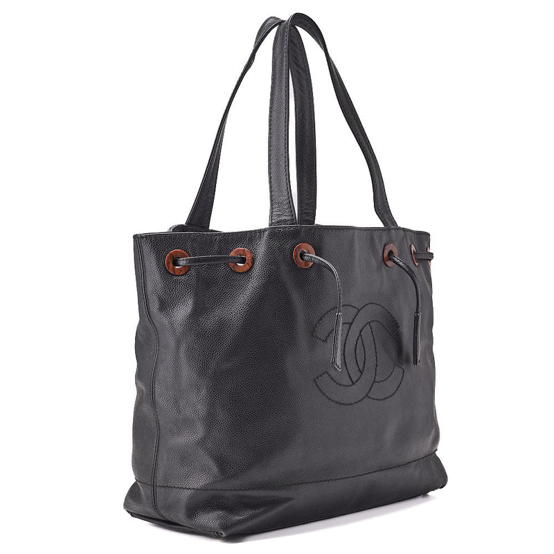 Sac à bandoulière d'occasion Coco Mark, cordon de serrage, cuir caviar, motif bois, quincaillerie dorée.
