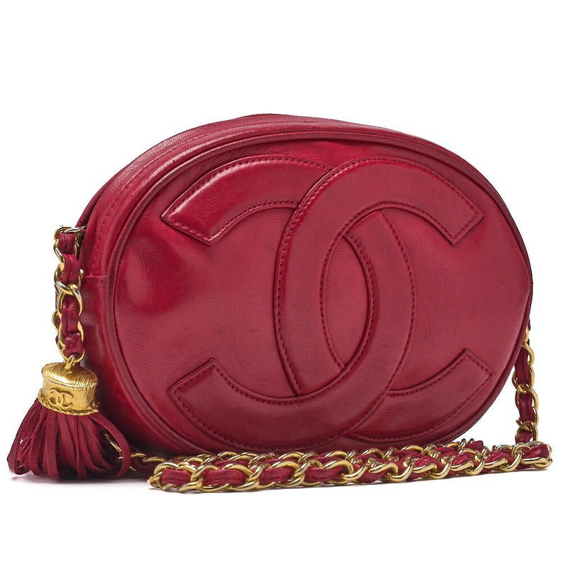 Sac bandoulière d'occasion, Coco Mark avec bandoulière à franges et chaîne, cuir d'agneau, rouge, finitions dorées, d'occasion