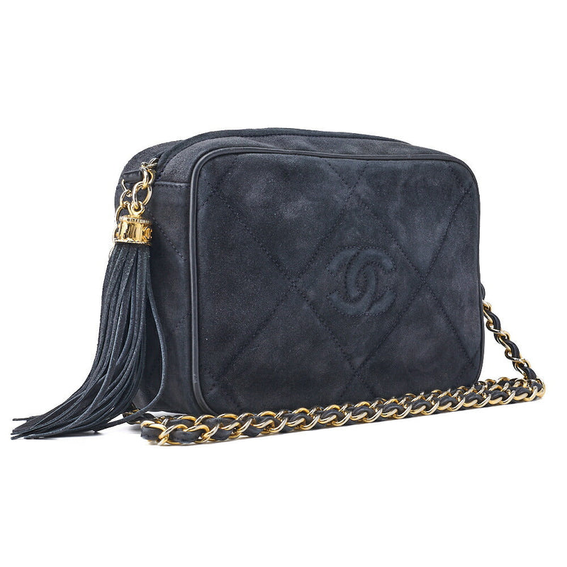Sac à bandoulière matelassé d'occasion avec chaîne et franges, en daim bleu marine et finitions dorées.