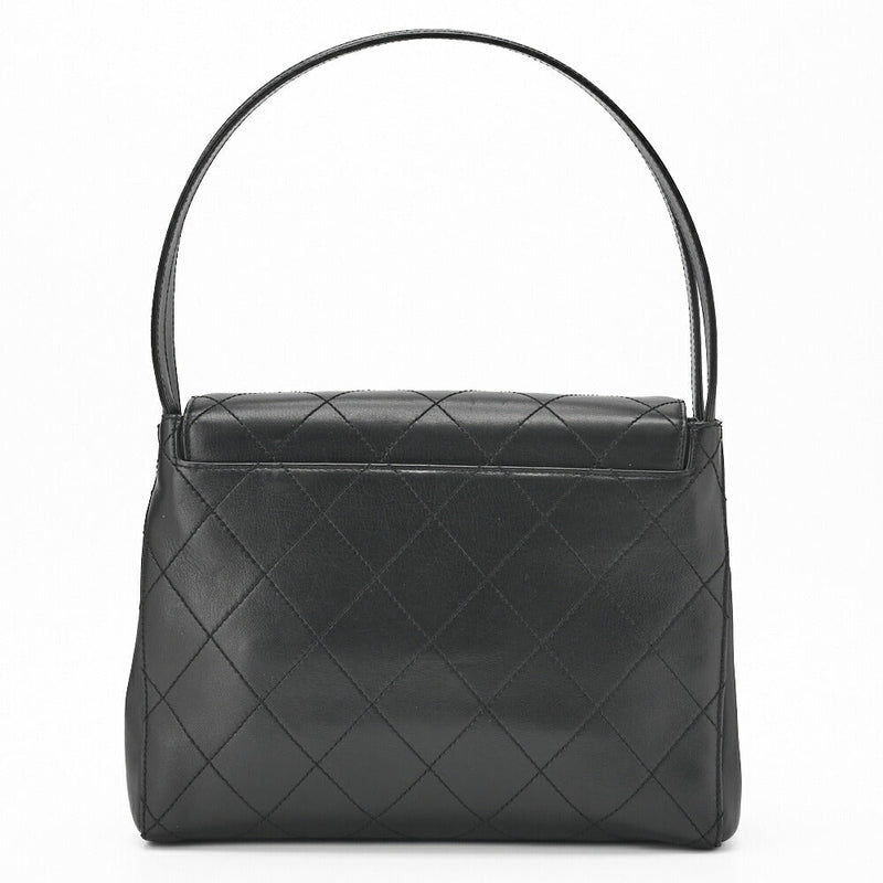Sac à main d'occasion matelassé à rabat en V avec fermoir à loquet en cuir de veau noir et finitions dorées.
