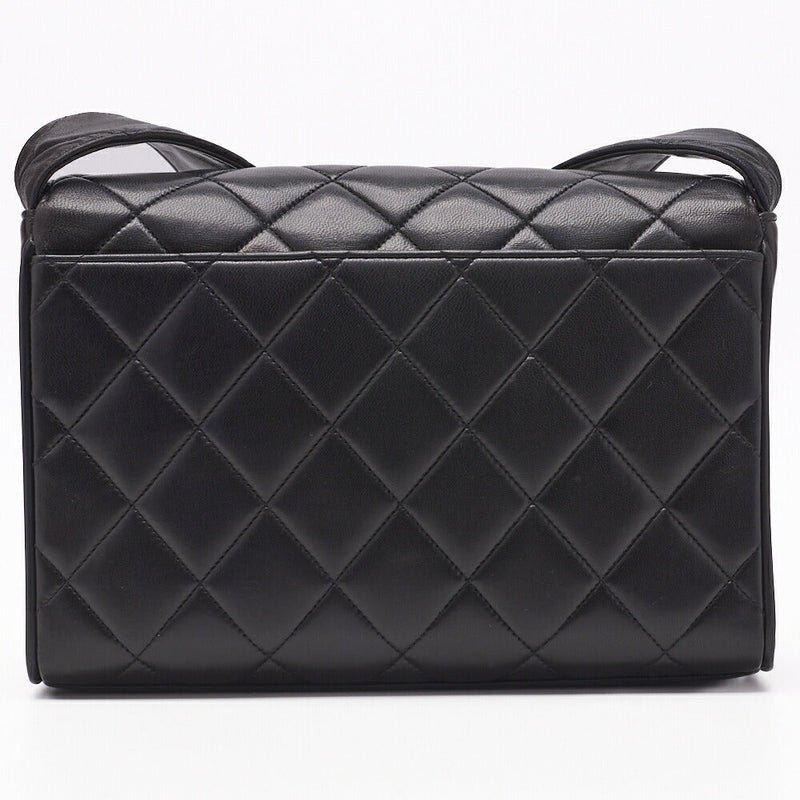 Sac à bandoulière matelassé d'occasion, rabat, fermoir pivotant, chaîne, cuir d'agneau noir, accessoires dorés.