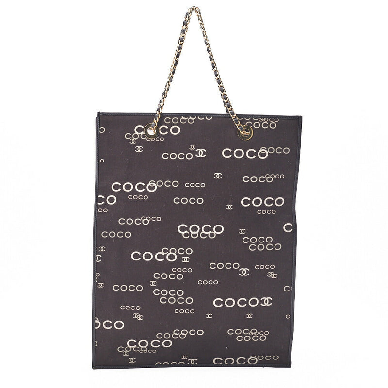 Sac à main d'occasion en coton noir à motif Coco, finitions dorées.