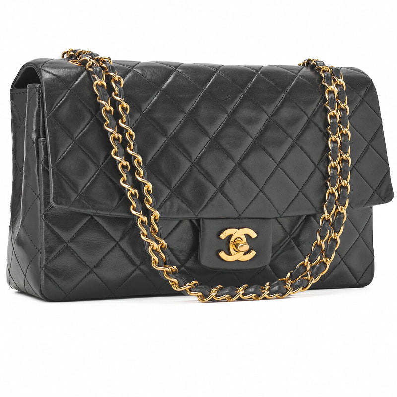 Sac bandoulière d'occasion en cuir d'agneau matelassé noir et métal doré.