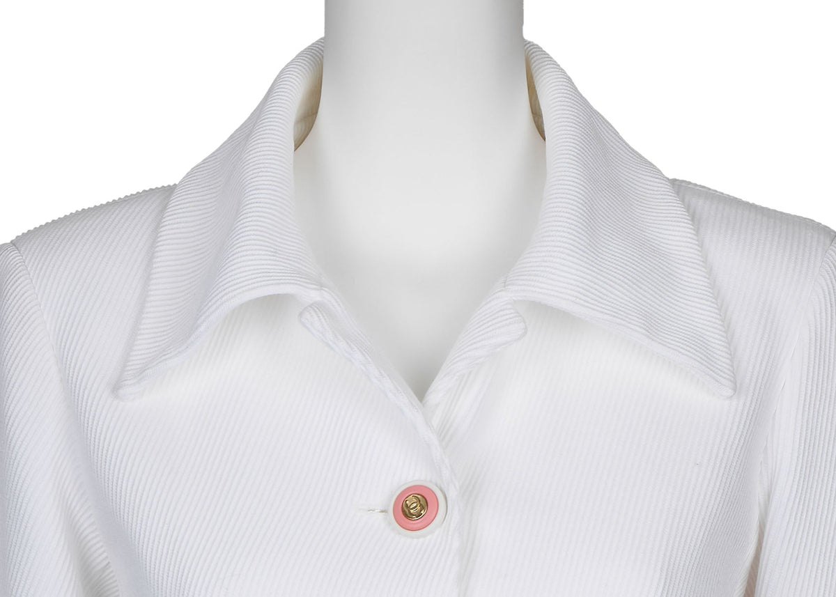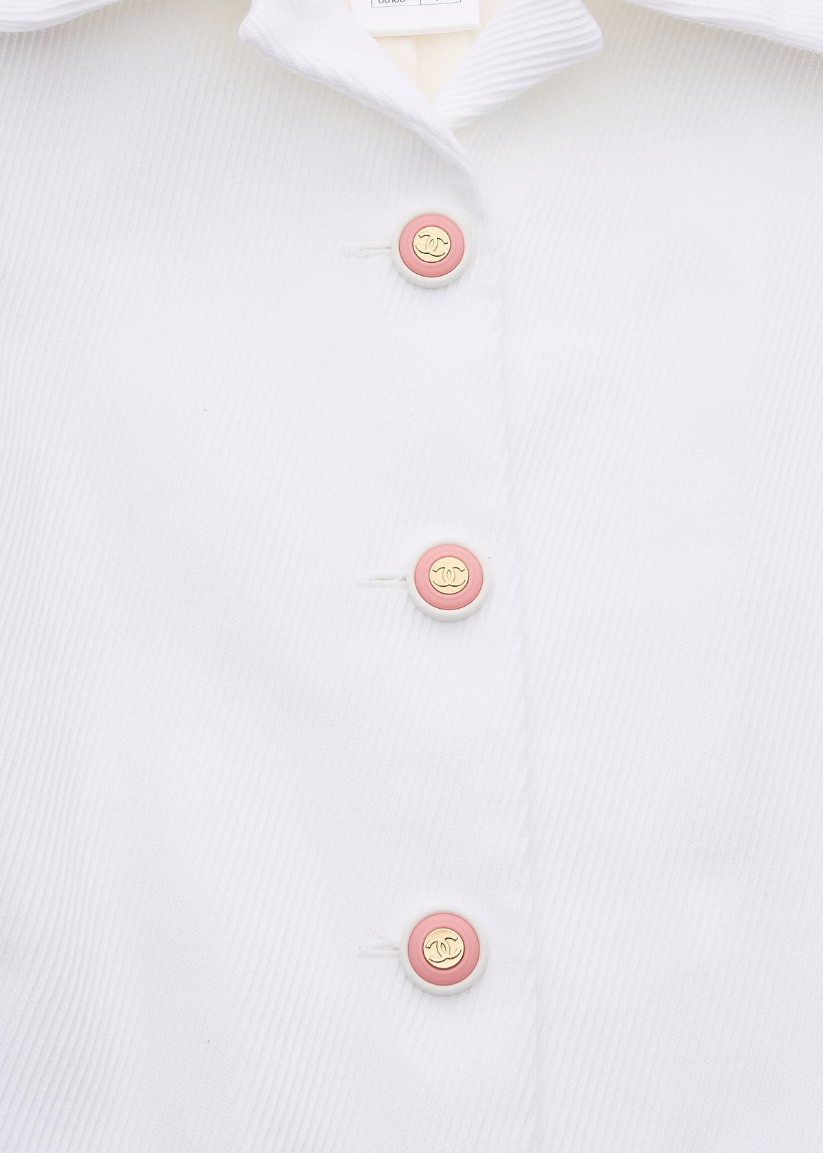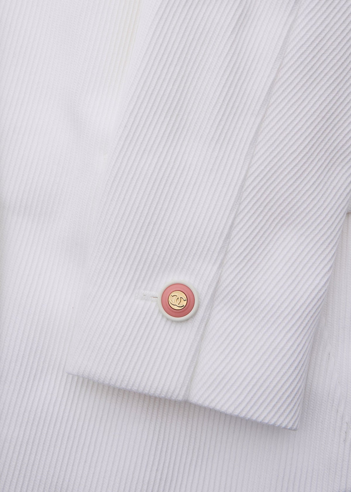 Sublimez votre garde-robe avec la superbe veste boutonnée Coco 34 de CHANEL , une pièce intemporelle qui incarne l'élégance et la sophistication. Confectionnée en 100 % coton premium, cette veste blanche est à la fois élégante et confortable, parfaite en toute occasion.