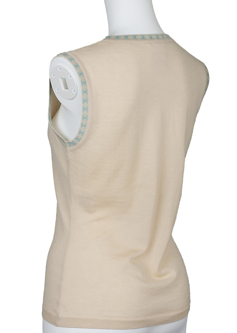 Gilet sans manches d'occasion, Coco Mark, tricoté, cachemire, beige, finitions dorées, d'occasion