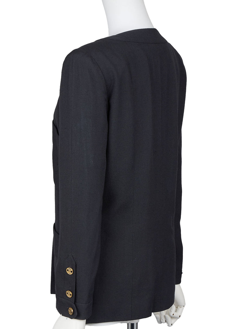 Veste sans col d'occasion, manteau d'extérieur, manches longues, lin, noir, finitions dorées, d'occasion