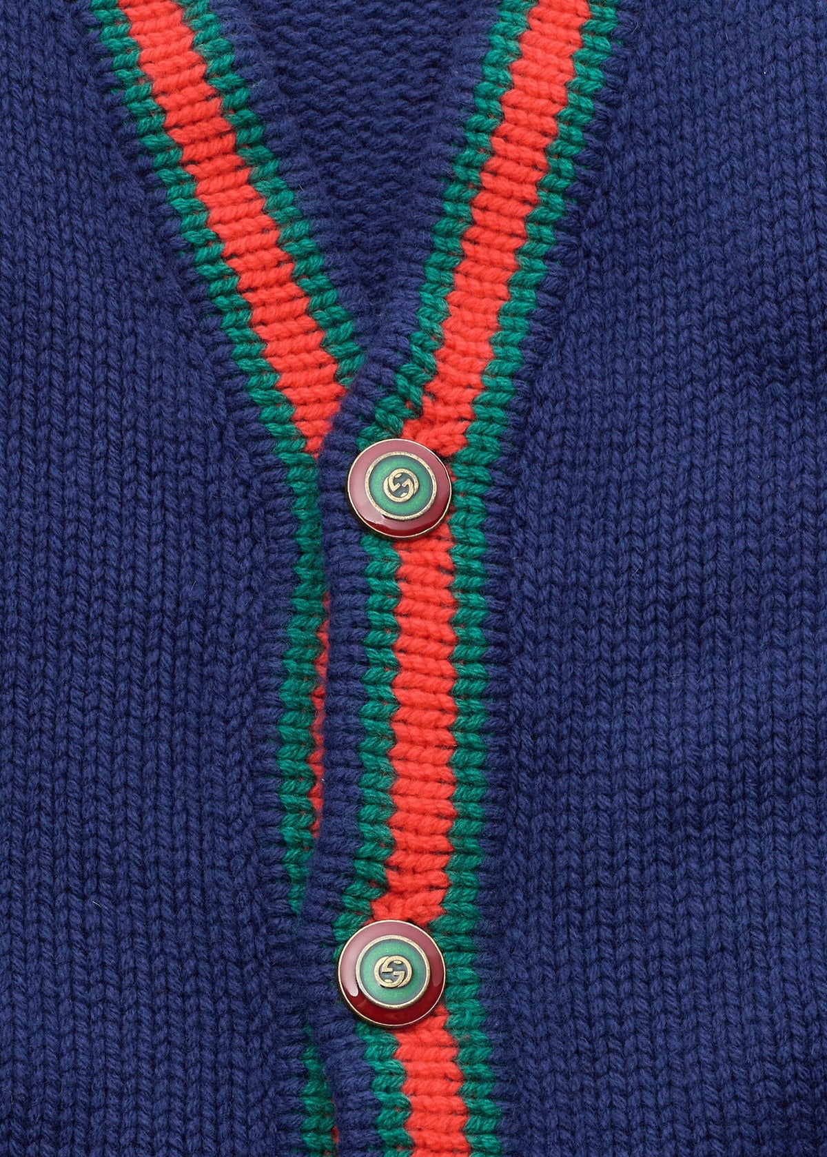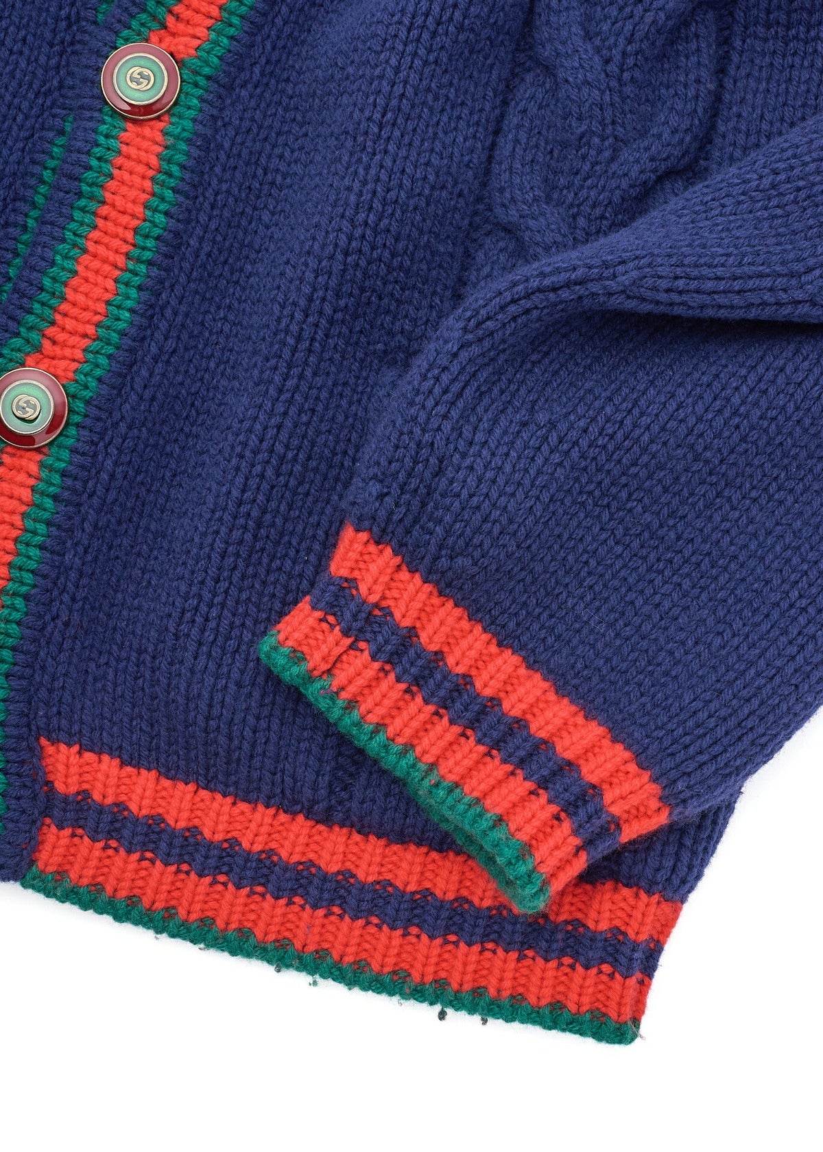 Appréciez une touche de luxe avec le cardigan Sherry Line 100e anniversaire de GUCCI, taille S, bleu marine . Ce cardigan raffiné, confectionné en 100 % laine de première qualité, incarne sophistication et style, parfait pour sublimer votre garde-robe.