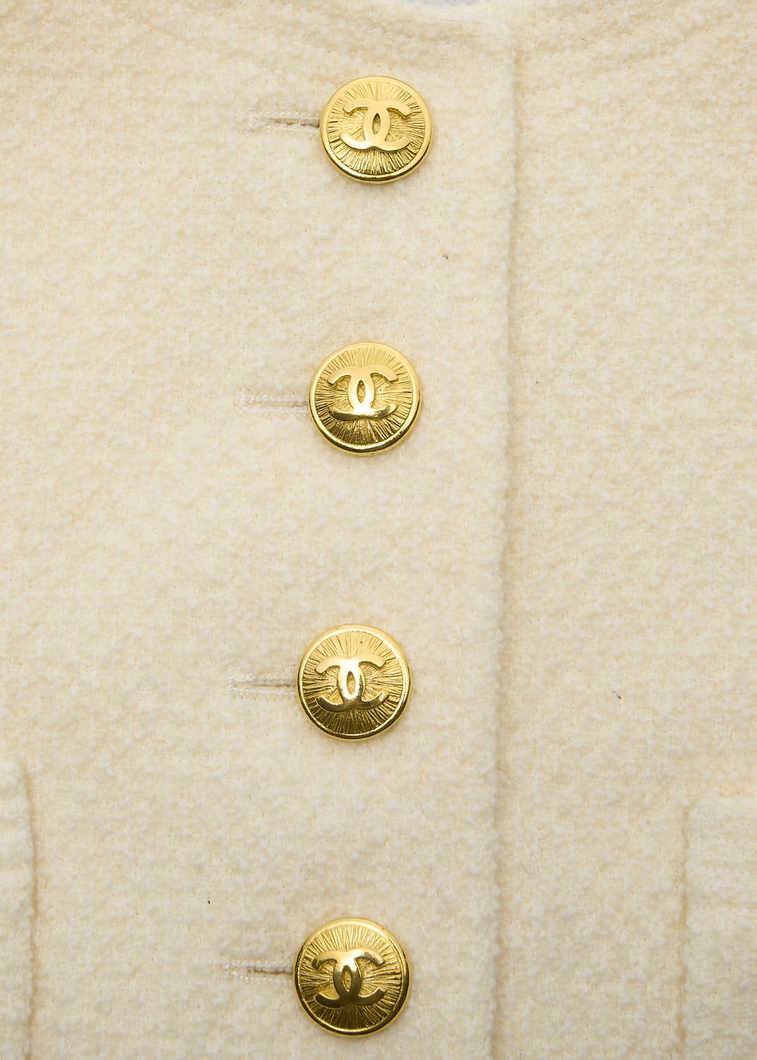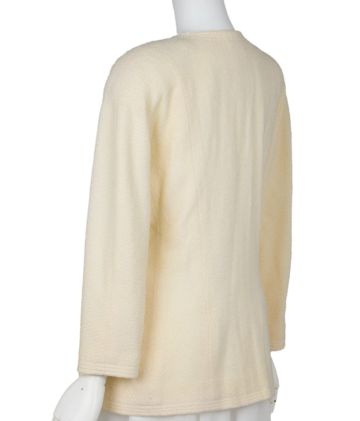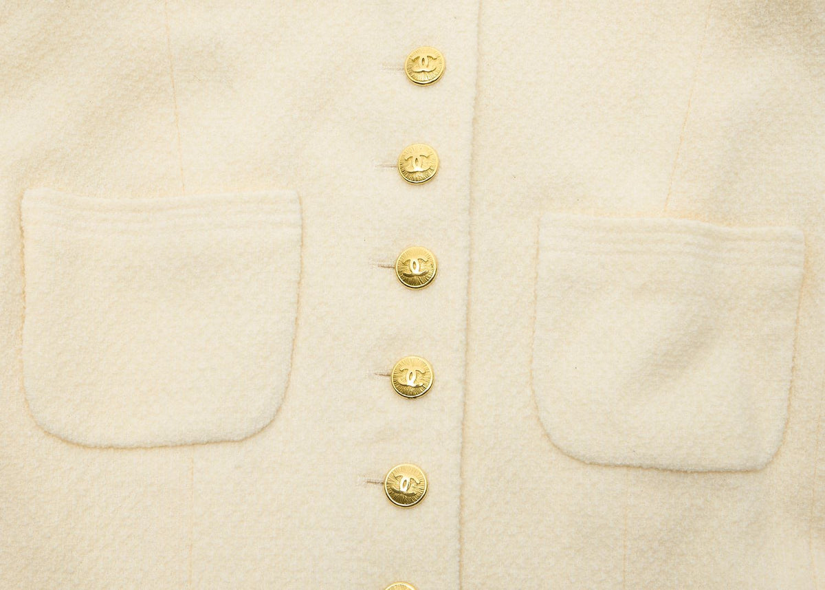 Veste sans col d'occasion, manches longues, laine, ivoire, finitions dorées