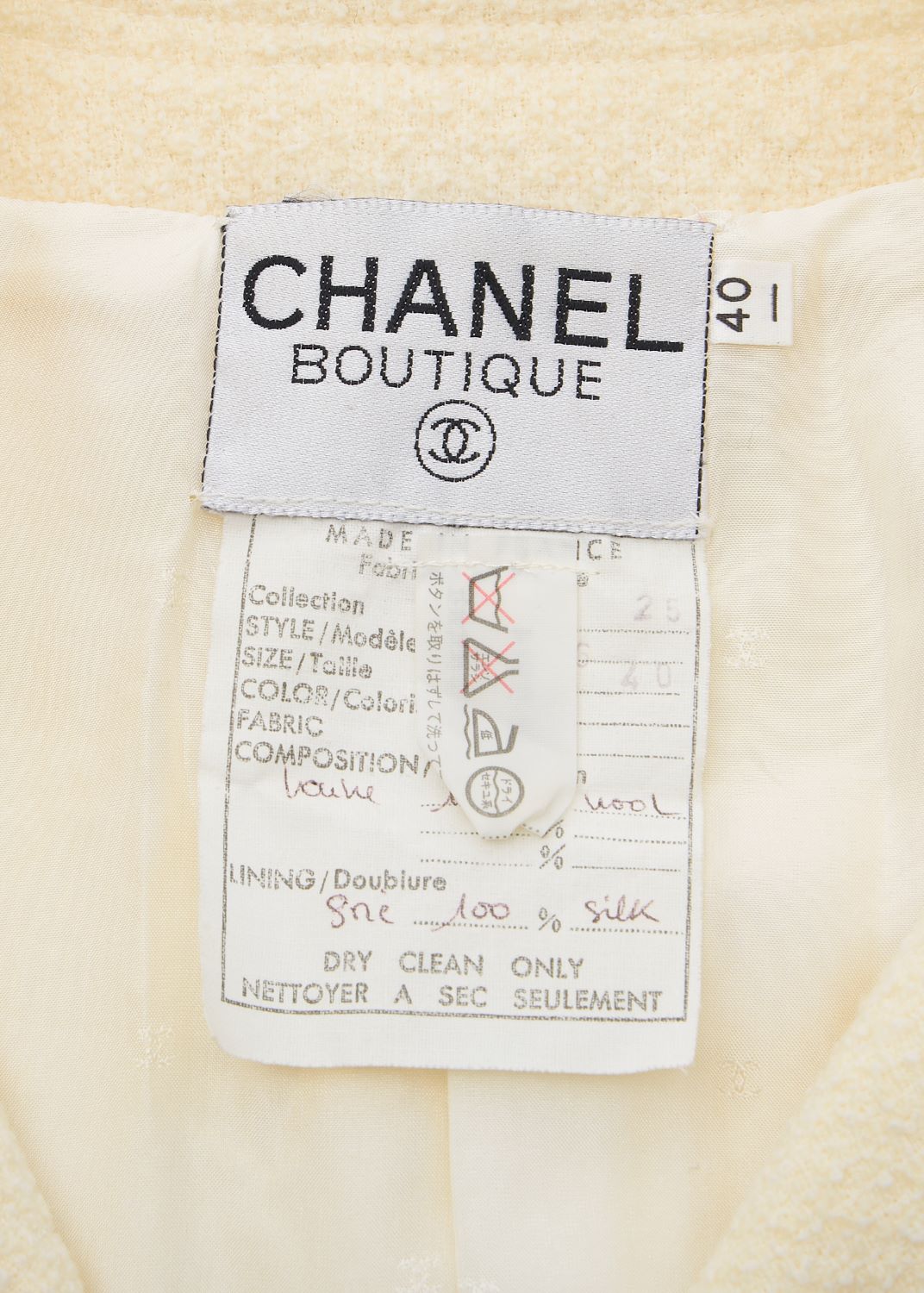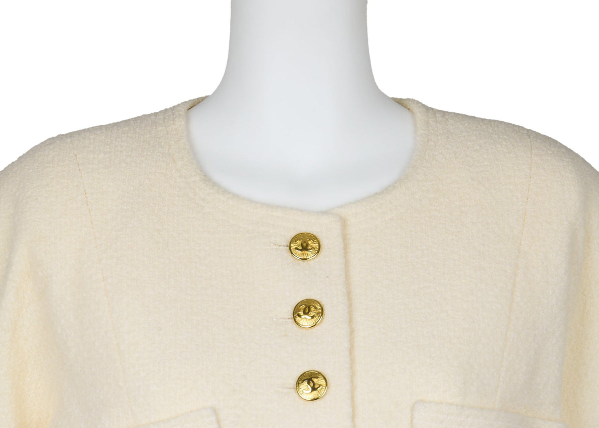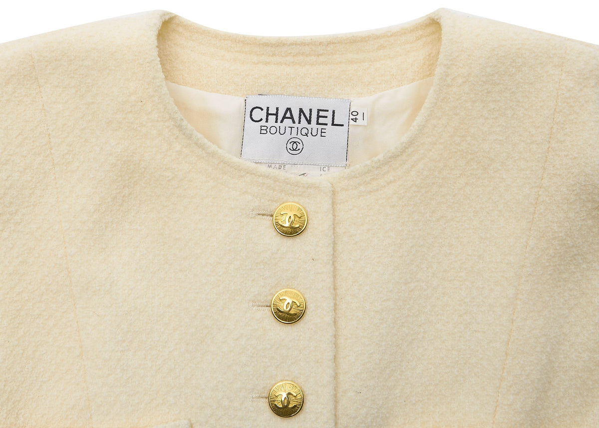Découvrez l'élégance de la veste sans col Coco Button 40 de CHANEL , une pièce d'extérieur époustouflante alliant sophistication et confort. Confectionnée en 100 % laine premium, cette veste ivoire sublimera votre garde-robe, idéale pour les sorties décontractées comme pour les événements plus formels.
