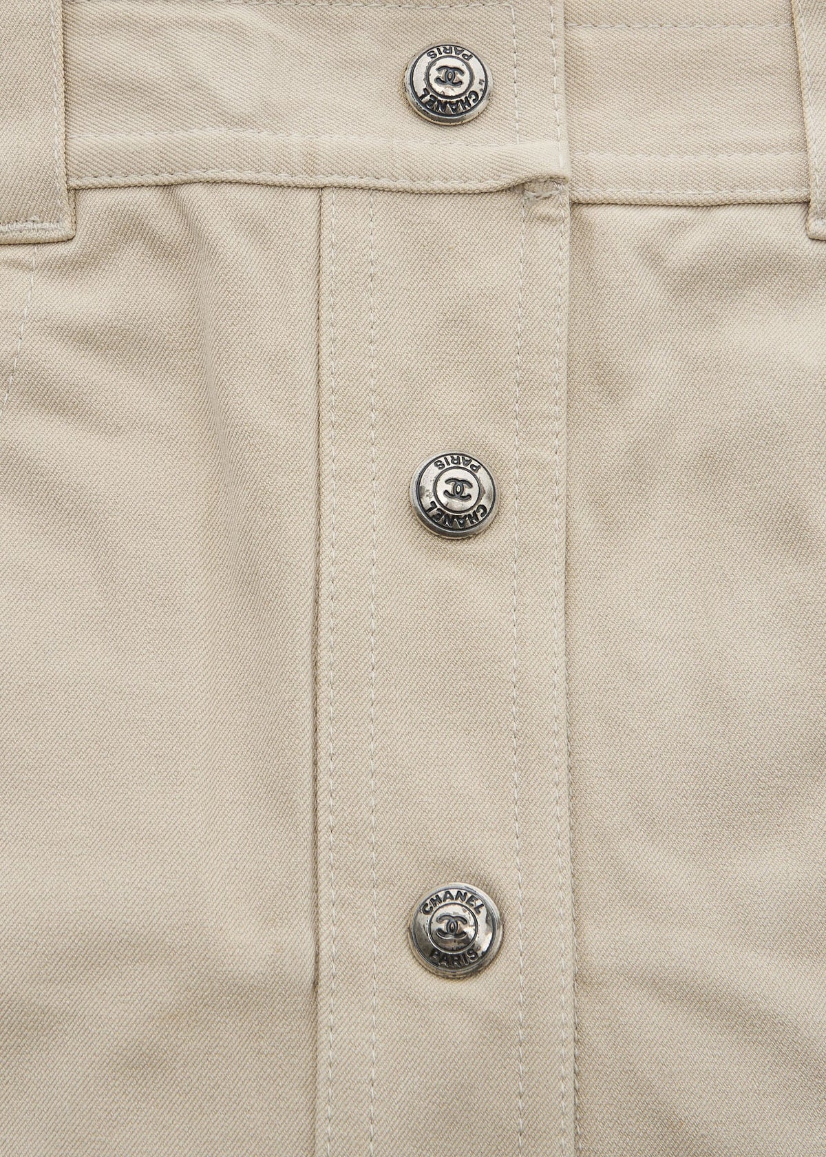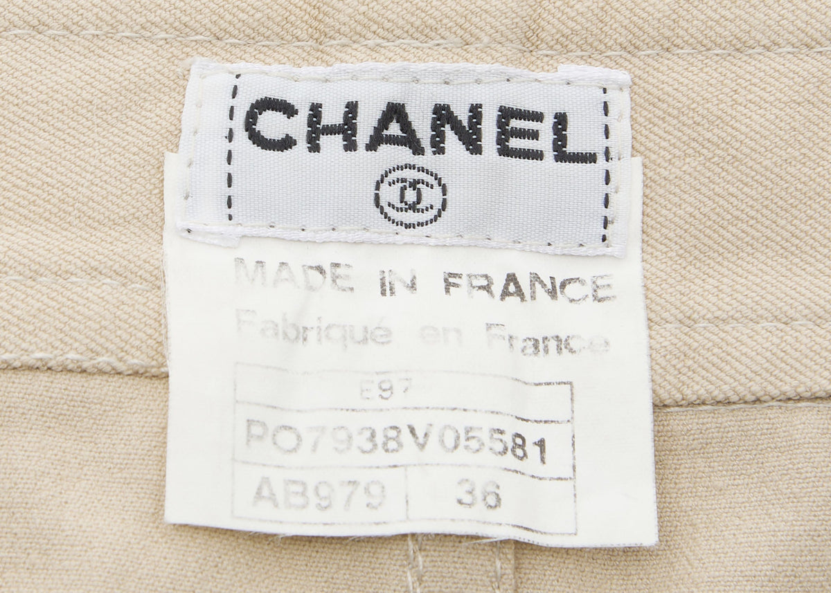 Sublimez votre garde-robe avec la jupe boutonnée Coco 36 de CHANEL , une superbe mini-jupe beige qui met en valeur l'élégance intemporelle de CHANEL. Confectionnée dans un mélange premium de 96 % de coton, cette jupe allie confort et durabilité, un indispensable de votre collection mode.