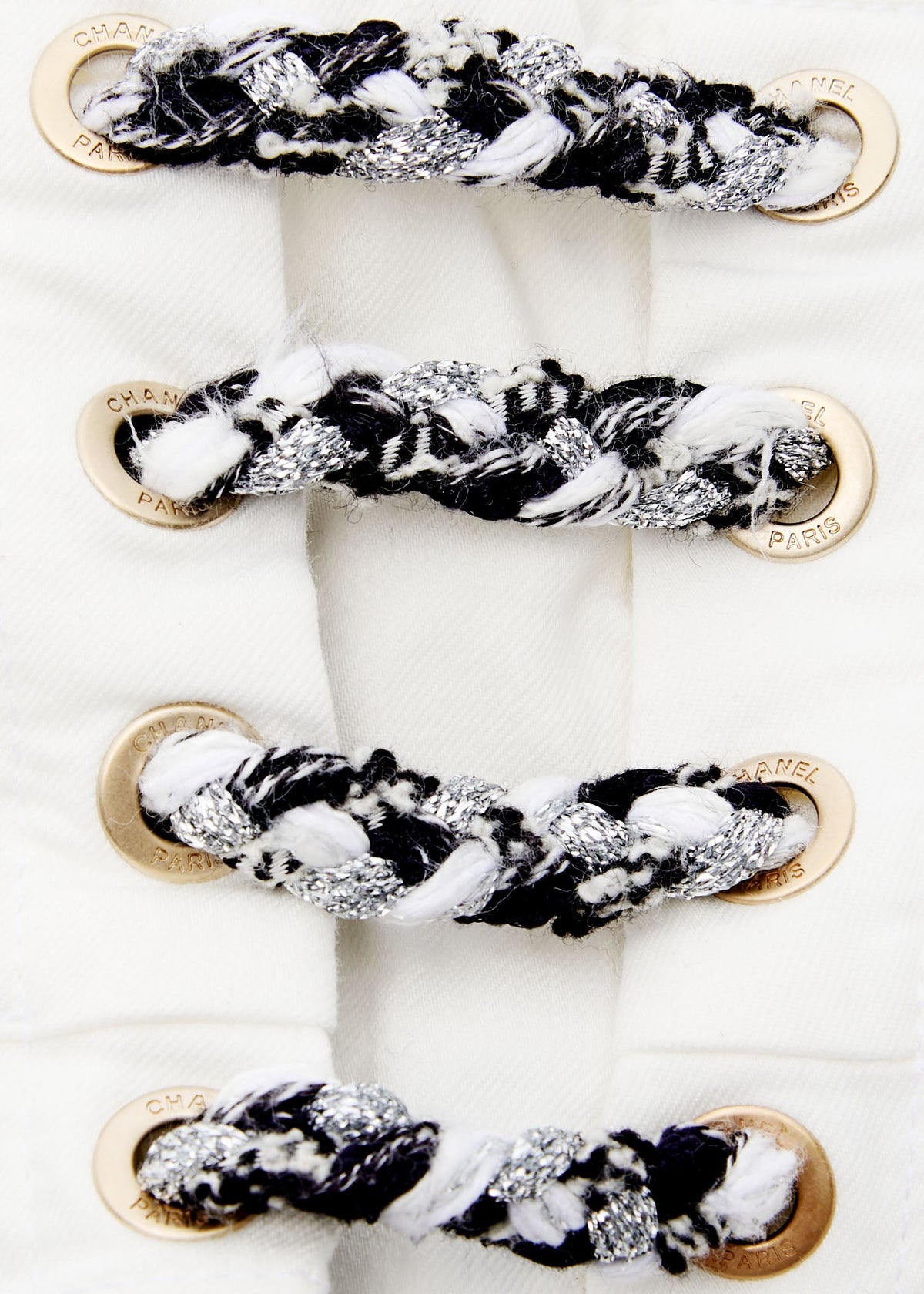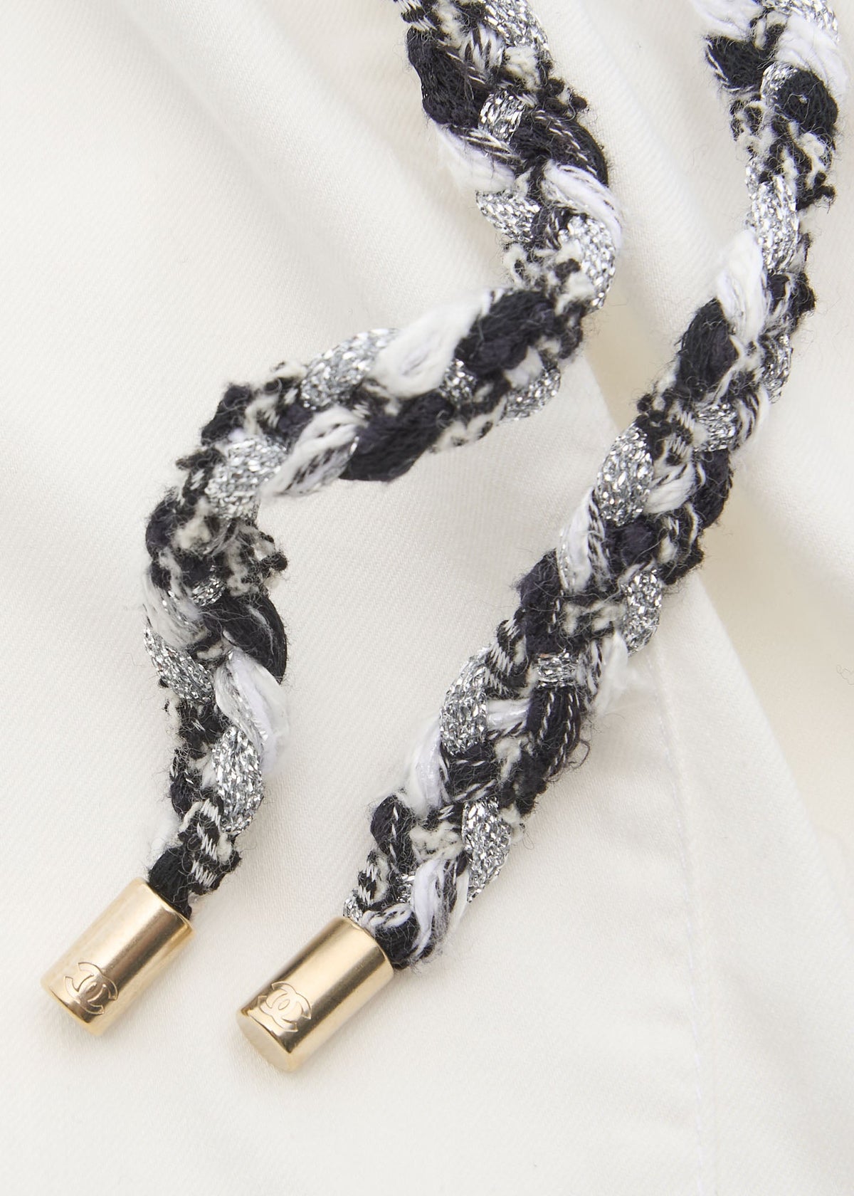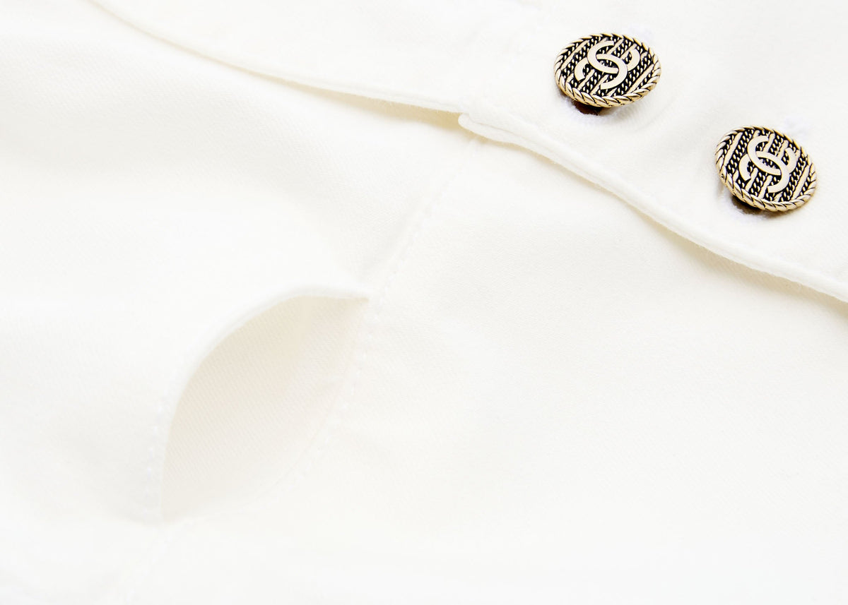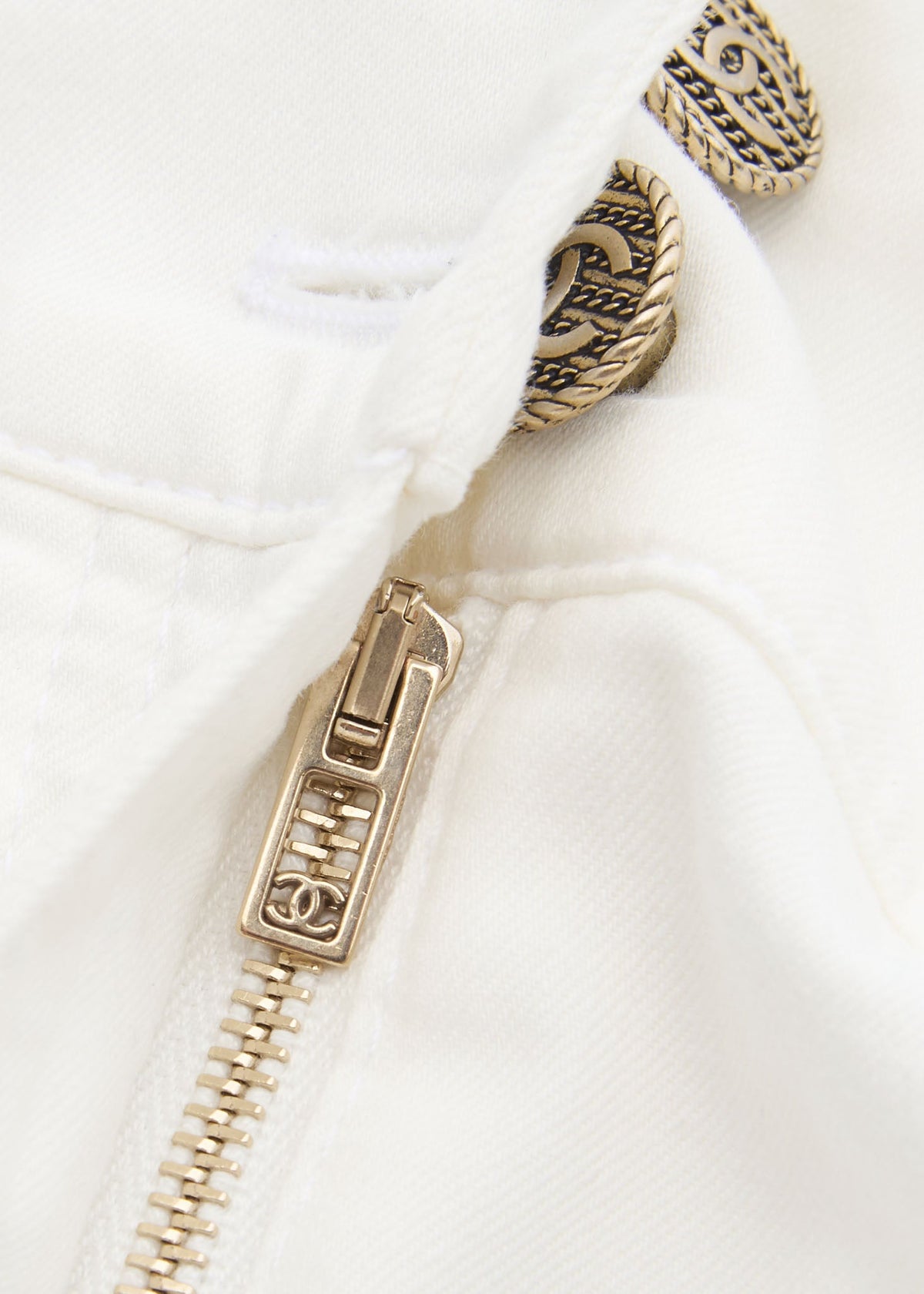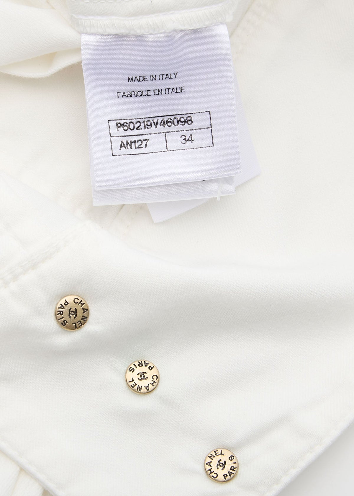 Sublimez votre garde-robe avec le pantalon large à boutons Coco CHANEL 34. Confectionné dans un luxueux mélange de 98 % de coton, ce superbe pantalon blanc incarne la sophistication chic et s'intègre parfaitement à toute garde-robe avant-gardiste.