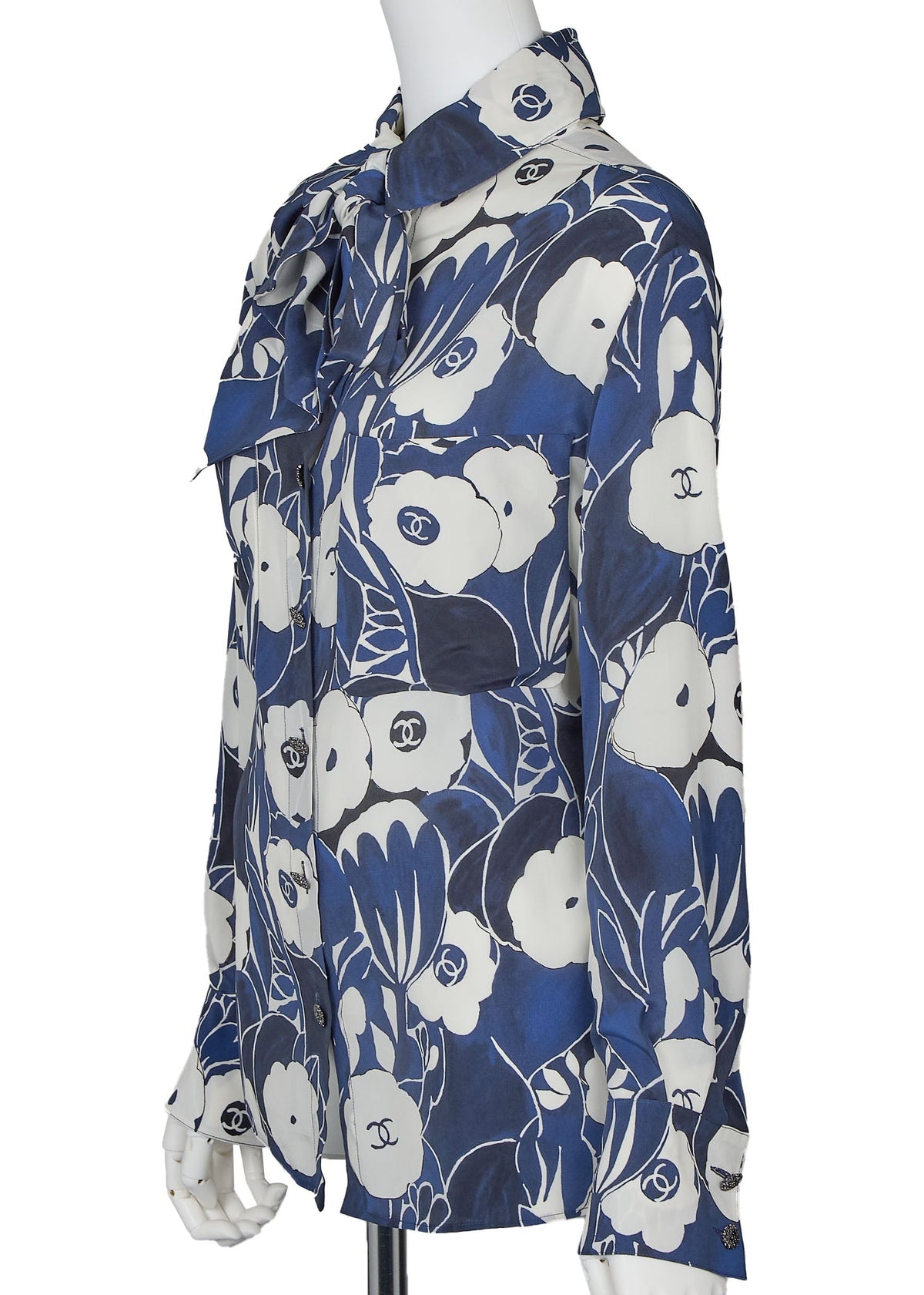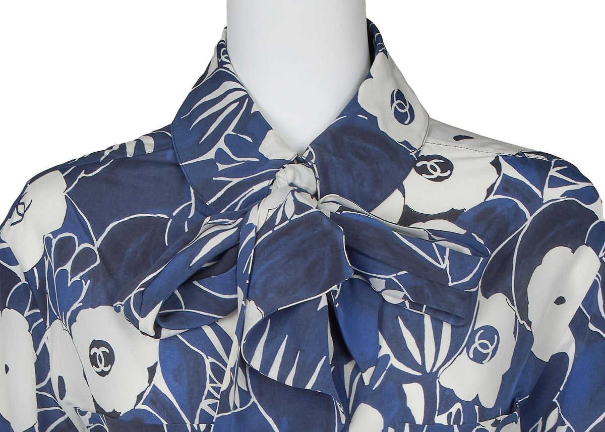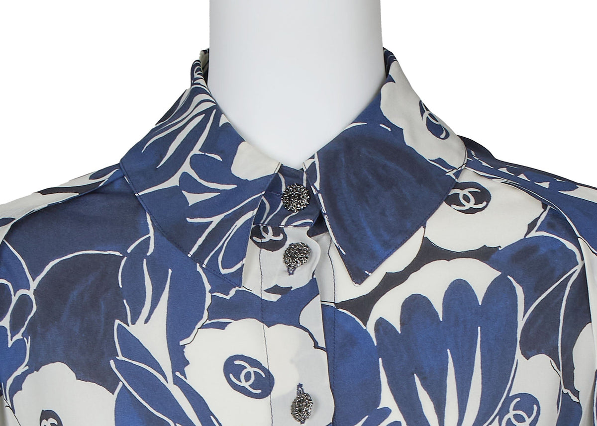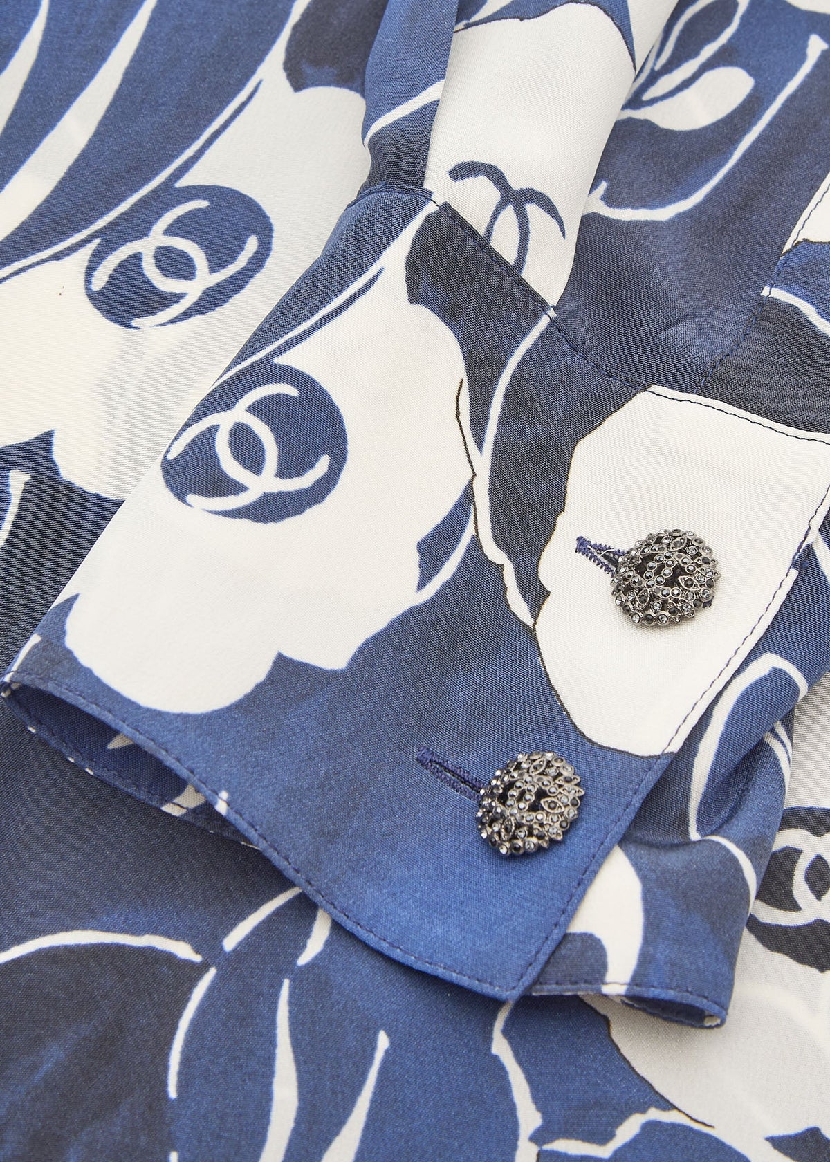 Sublimez votre garde-robe avec la superbe blouse boutonnée Coco Mark Camellia de CHANEL, déclinée dans une superbe palette de bleu et de blanc . Ce luxueux cardigan à manches longues, coupé-cousu, est confectionné en 100 % soie, offrant un drapé raffiné et un confort incomparable.
