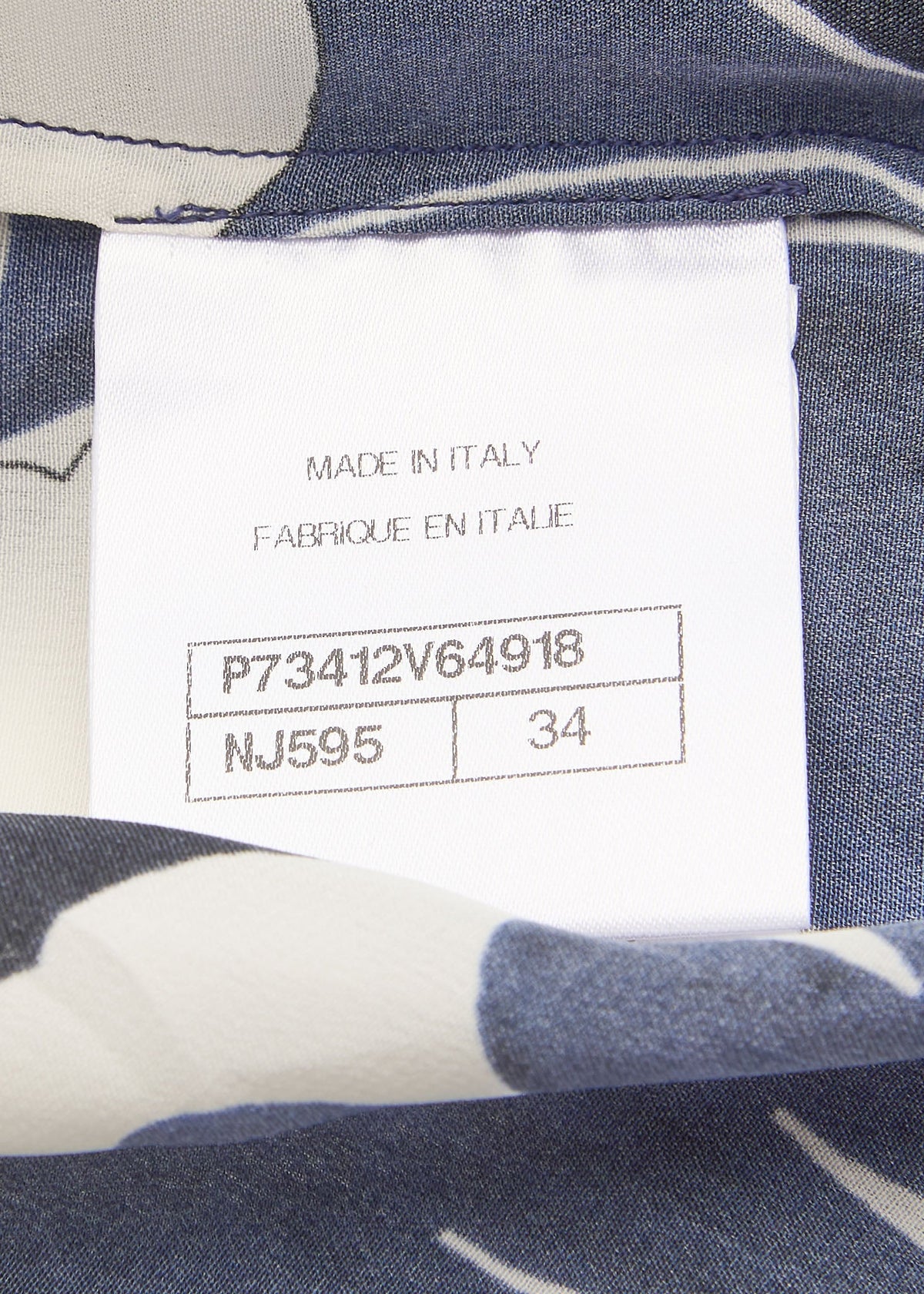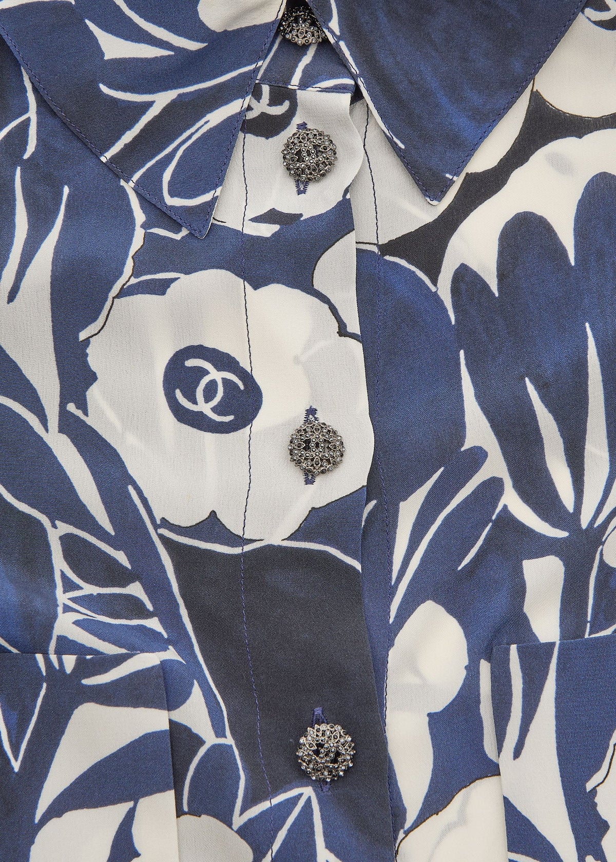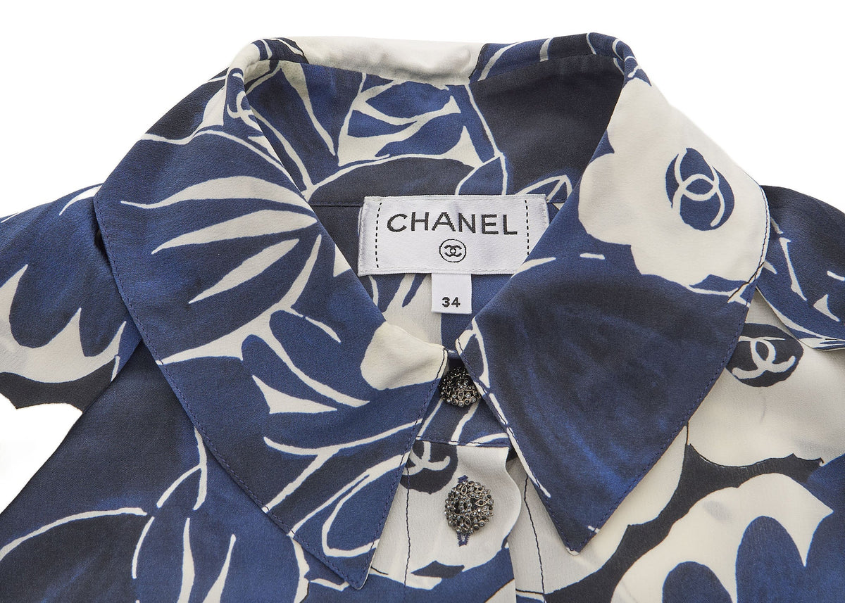 Sublimez votre garde-robe avec la superbe blouse boutonnée Coco Mark Camellia de CHANEL, déclinée dans une superbe palette de bleu et de blanc . Ce luxueux cardigan à manches longues, coupé-cousu, est confectionné en 100 % soie, offrant un drapé raffiné et un confort incomparable.