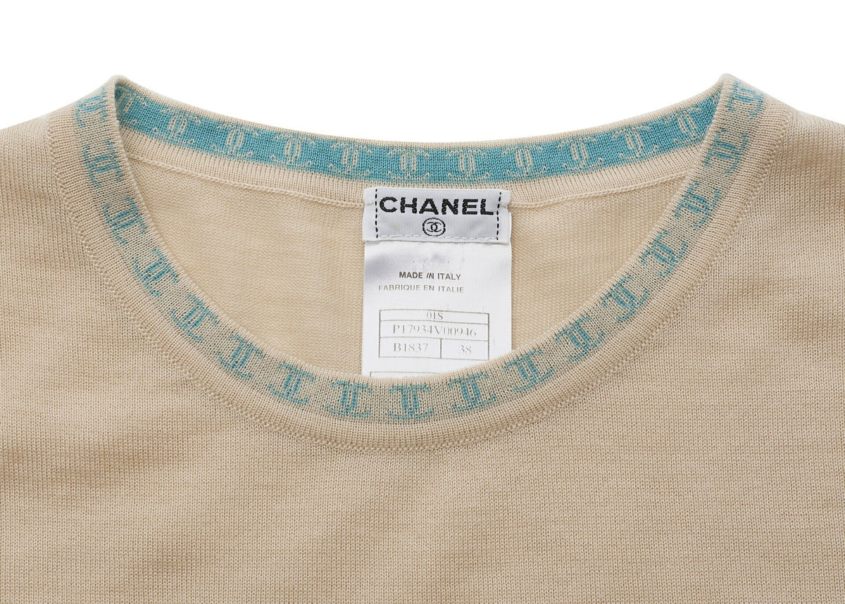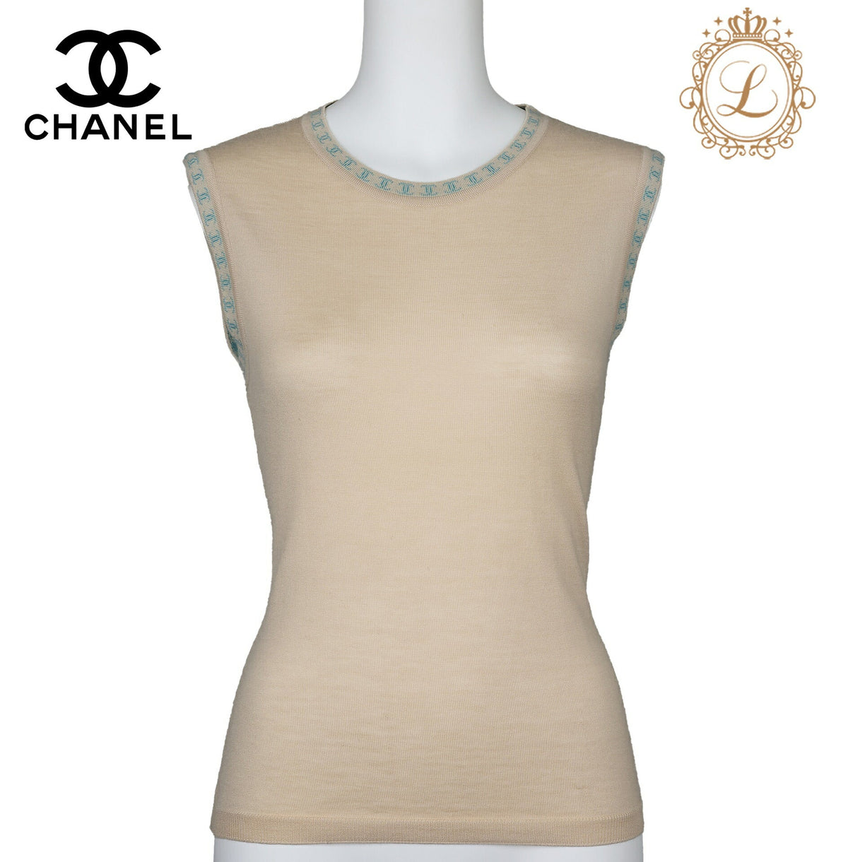 Sublimez votre garde-robe avec le gilet sans manches Coco Mark de CHANEL, haut en maille, t-shirt 38 beige, vêtement de marque d'occasion - Très bon état . Confectionné en 100 % cachemire luxueux, ce gilet raffiné offre une douceur et une chaleur incomparables, un ajout intemporel à votre collection.