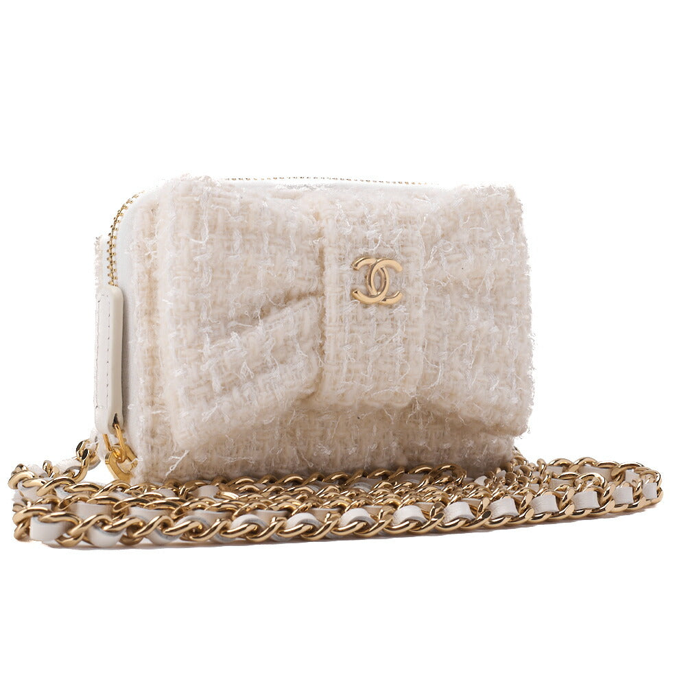 Confectionné en tweed haut de gamme dans une teinte blanche classique et orné de luxueuses finitions dorées, ce sac bandoulière respire la sophistication. Ses dimensions compactes d'environ 11 cm de large x 8 cm de haut x 2,5 cm de profondeur en font le compagnon idéal pour transporter vos essentiels sans compromettre le style.