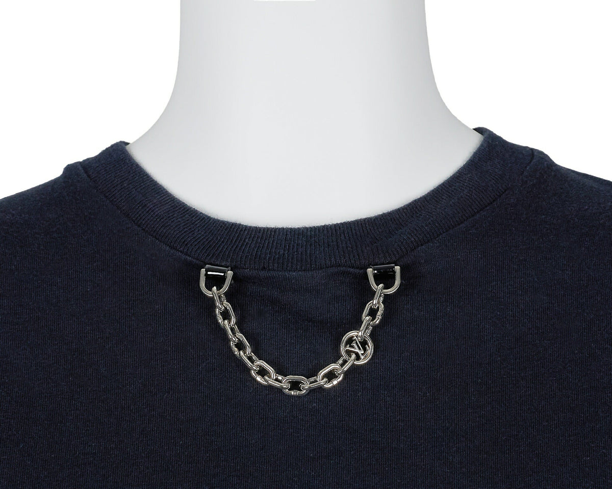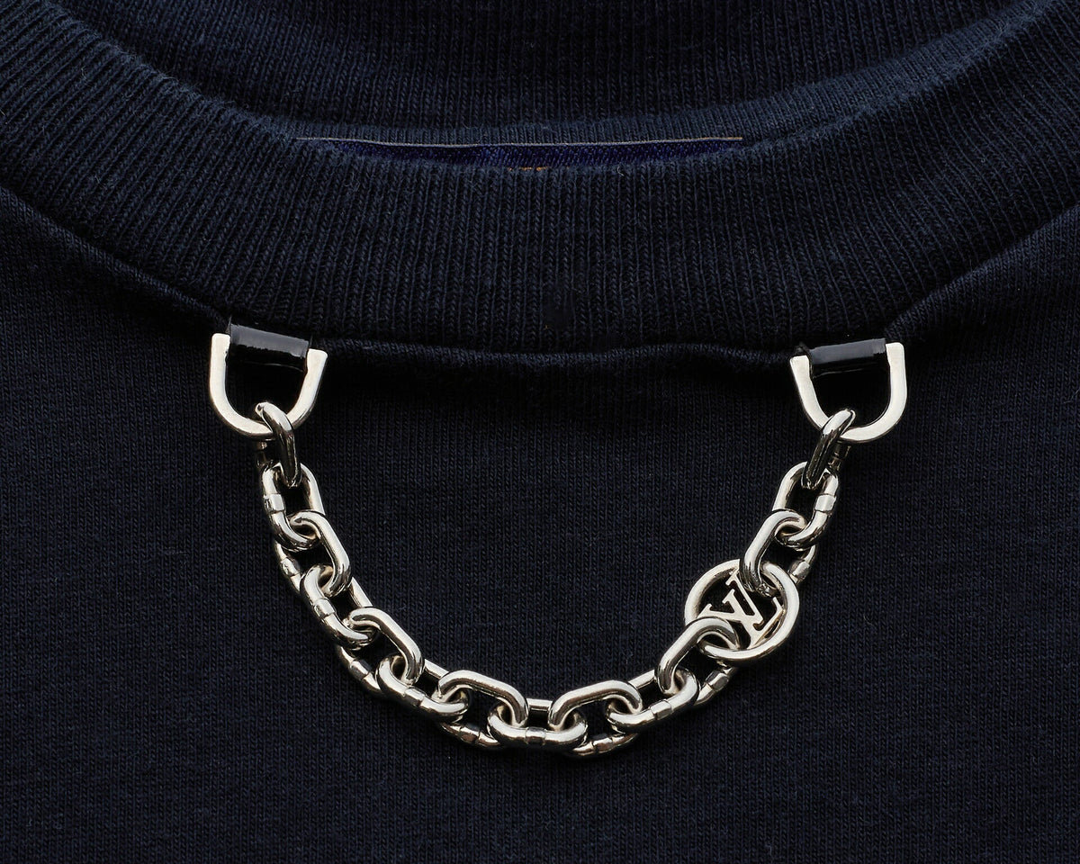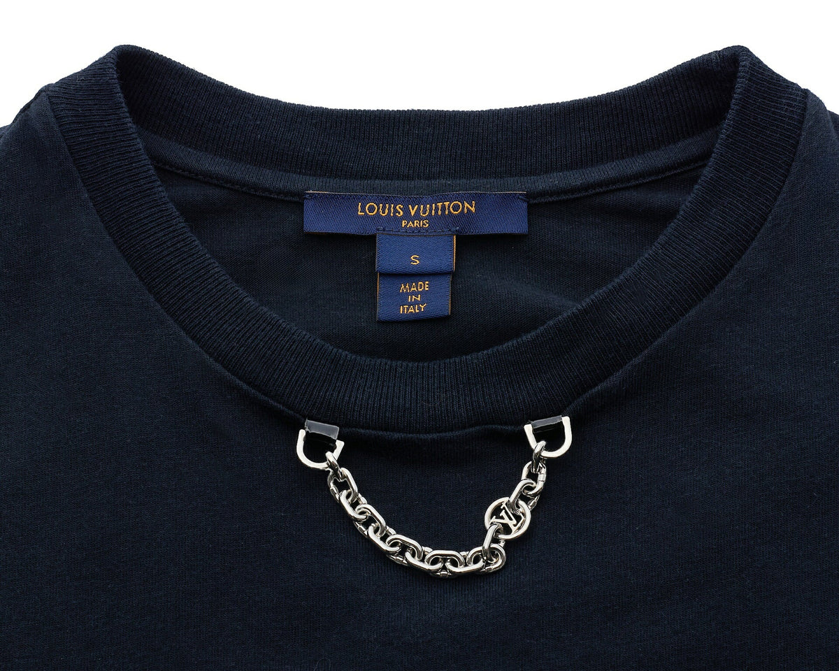 T-shirt Vuitton d'occasion, détail chaîne, coupé-cousu, coton, noir, finitions argentées, d'occasion