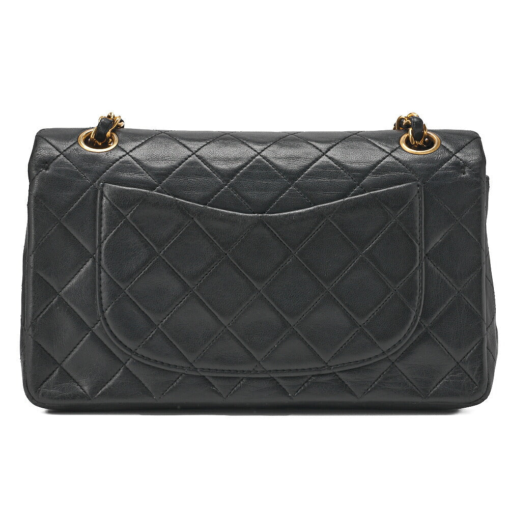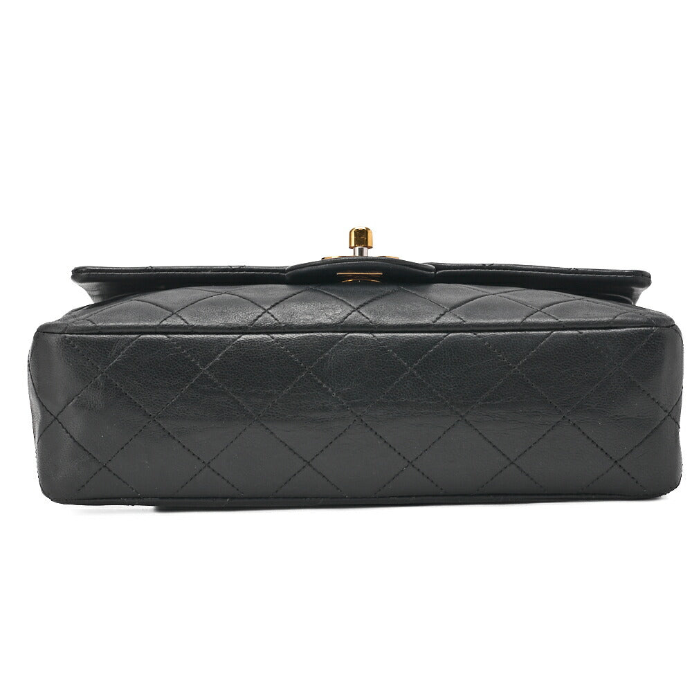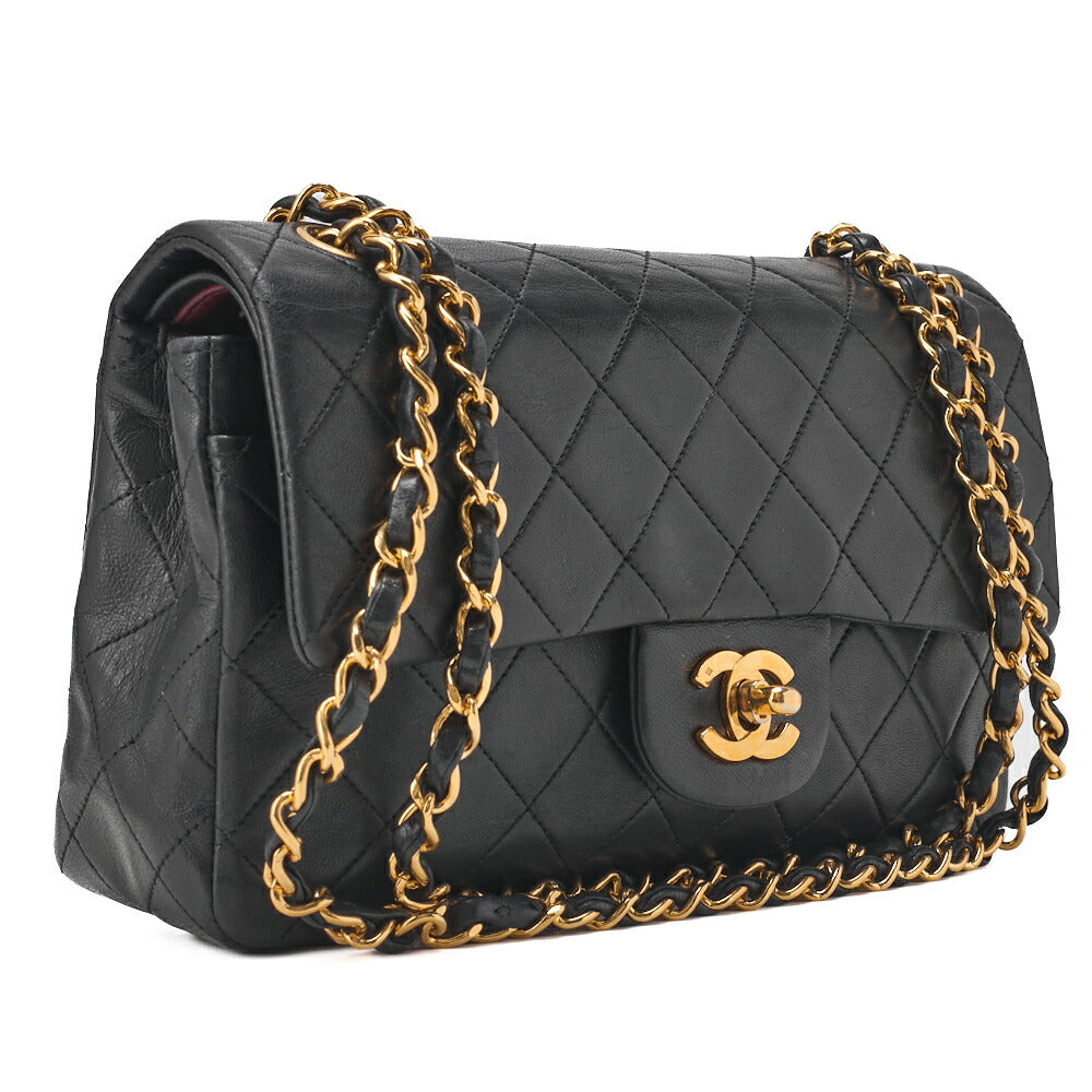 Sac bandoulière d'occasion Matelasse 23, double rabat, chaîne, cuir d'agneau noir, accessoires dorés.