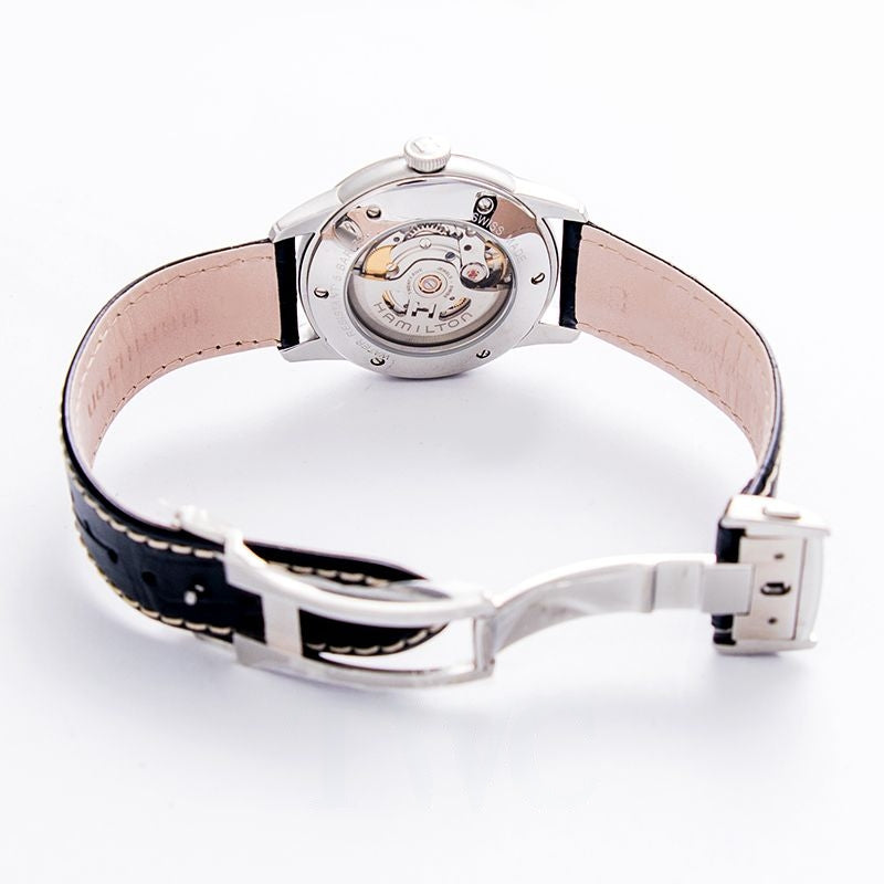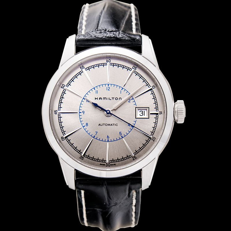 The Hamilton American Classic Railroad Auto draws inspiration from the original classic of improving early railroad safety with 21st century infusion. The Swiss made brilliance is enclosed in a 40mm stainless steel case a black calf-leather strap with grained imitation alligator and a folding clasp. This bold article is extended by a pristine silver-toned dial which represents the wheels of early trains and hour markers around the inner rim. It is further adorned with luminous silver long-drawn-out indexed hour makers and minute markers around the outer rim $$with sleek luminous silver hands and a silky blue second hand. The Hamilton H40555781 has a date window at 3 o' clock and a powerful H-10 caliber with scratch resistant sapphire crystal $$which is water resistant at 50M.