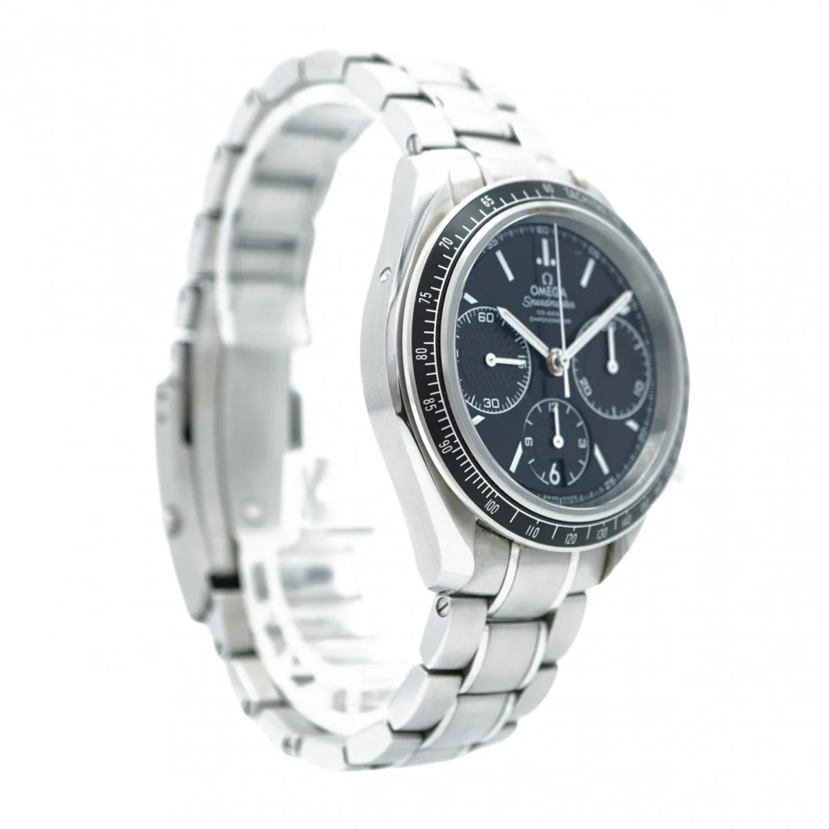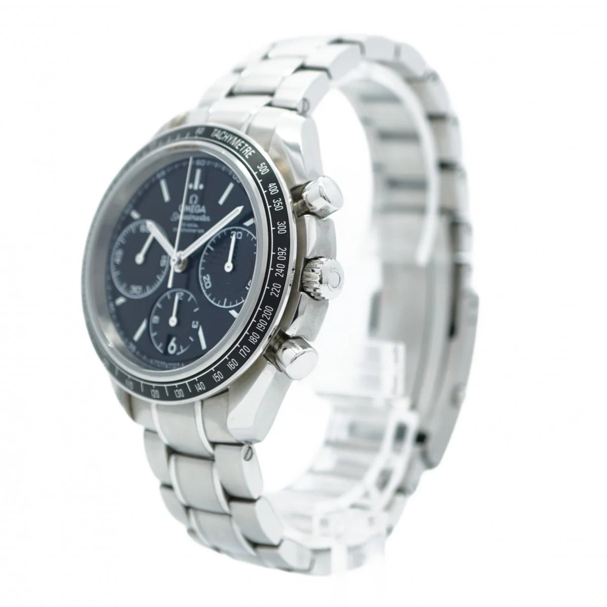 A compact, motorsport-inspired Speedmaster with everyday versatility. The 40 mm stainless-steel case frames a black dial with three registers and a date neatly integrated at 6 o’clock. A matte tachymeter bezel nods to pit-lane timing, while domed, anti-reflective sapphire keeps things legible. Inside beats Omega’s Co-Axial chronometer calibre 3330—a column-wheel chronograph with a silicon balance spring—for precise, durable performance. Water-resistant to 100 m and fitted to a solid steel bracelet, it’s a modern Speedy you can wear anywhere.