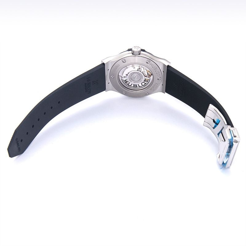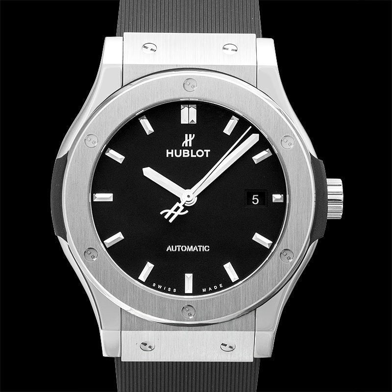 If there's a Swiss watch that redefines luxury with its perfect design, then it has to be Hublot Classic Fusion Automatic. This 42mm 542.NX.1171.RX watch has a well-polished titanium casing and a fixed bezel with eye-catching screws embedded on it. The case has an attached black rubber strap with a folding clasp that makes for comfortable and safe wear. This Hublot creation is rising to fame owing to its flat matte black dial, shielded by scratch-proof sapphire glass, and featuring silver-toned hands and index markers. A prominent date display window sits at the three o'clock position ??the Hublot Classic Fusion Automatic 542.NX.1171.RX runs on HUB1110 self-winding movement (42-hour power reserve) and has a water resistance of 50 meters, becoming one of the most stylish, durable, and useful Swiss-made wrist wears.