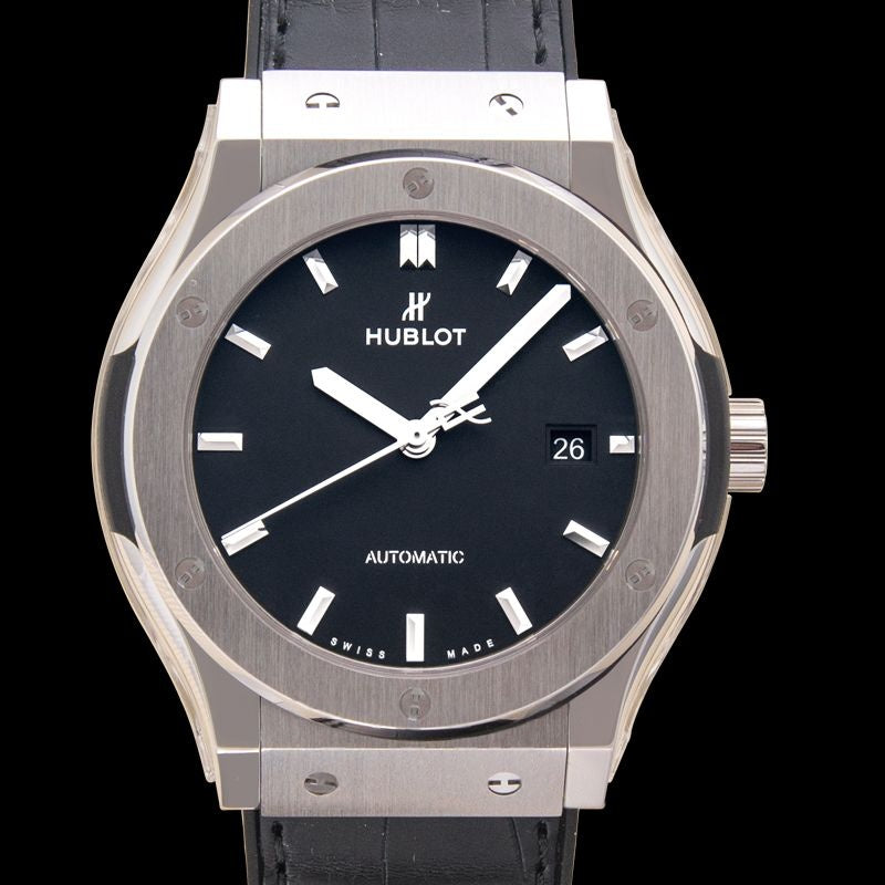 Hublot Classic Fusion Automatic Black Dial Titanium is a timeless piece of wrist wear that's rising to fame because of its trendy and elegant design. It's grey titanium casing measures 42mm and comes with a black rubber or alligator strap, equipped with a deployment clasp. The fixed titanium bezel further heightens the appeal of this 542.NX.1171.LR watch. The black analogue dial is one of the most attractive features of this Hublot creation as it sports meticulously-designed, silver-toned hands, and index markers. It is enclosed by a scratch-proof sapphire glass crystal and transparent case back. The Hublot Classic Fusion Automatic Black Dial Titanium runs on HUB1112 automatic movement with 42-hour power reserve and is durable water-resistant at 50 meters.