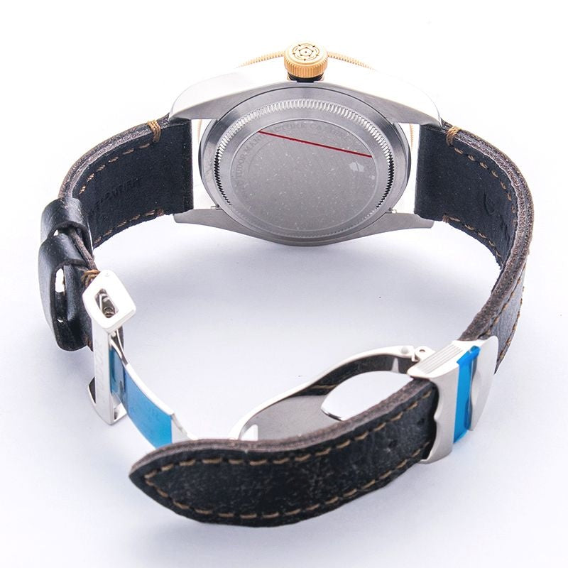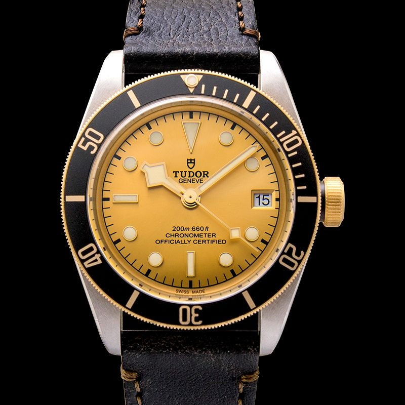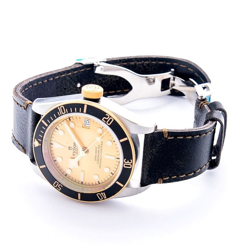 If you favour leather strapped watches as opposed to bracelet ones, then this Tudor Heritage Black Bay 79733N-0003 Automatic men's watch is the right contender for your heart. The 2018 model has a solid case back, a diameter of 41mm, height of 12.7mm, and lug width of 22mm. The dial is analogue and coloured in champagne with luminous gold-tone hands. There is an easy to use chronometer and many side benefits to this watch. Water resistance is set at 200 meters, and the power reserve is 70 hours. This Tudor line of luxury watches literally has something for the taste of any gentleman. Combine this with their superb quality, and you have a win-win choice.
