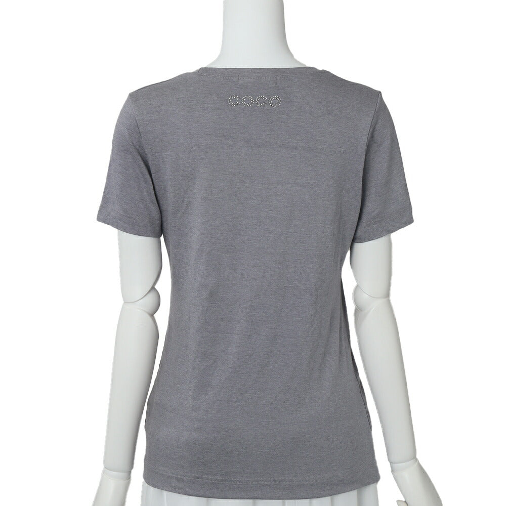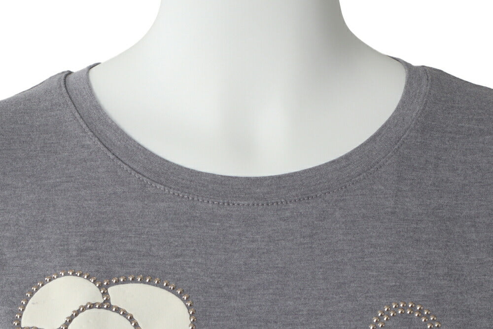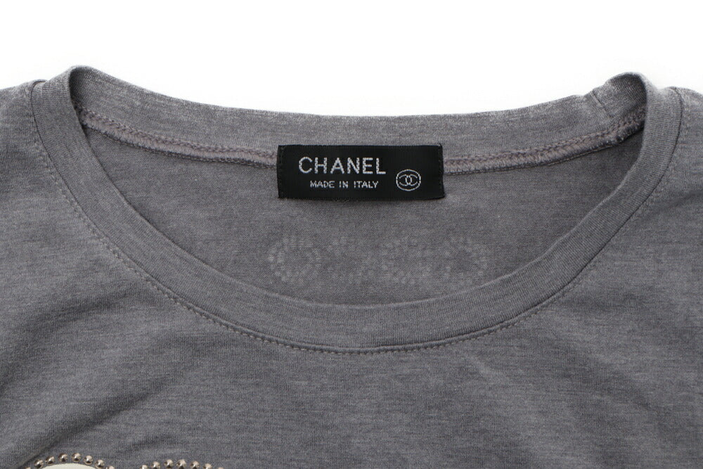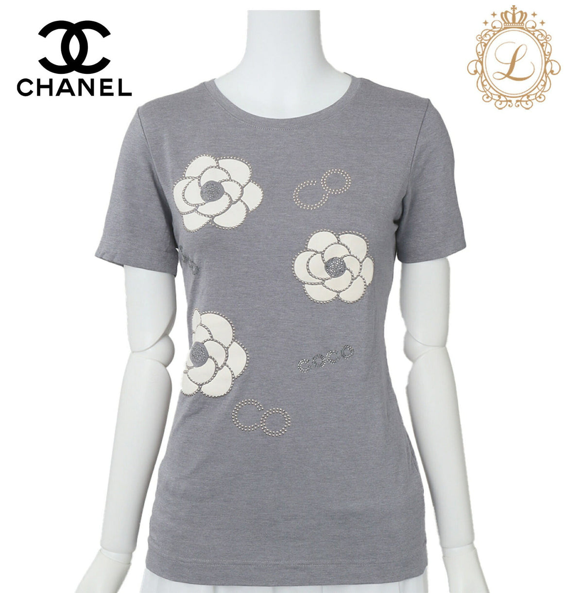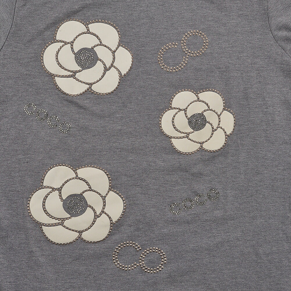 Elevate your wardrobe with the CHANEL Camellia Coco Mark T-shirt, a stunning piece from the renowned fashion house that embodies elegance and sophistication. This short sleeve cut-and-sew top in a versatile gray color is perfect for both casual outings and more refined occasions.