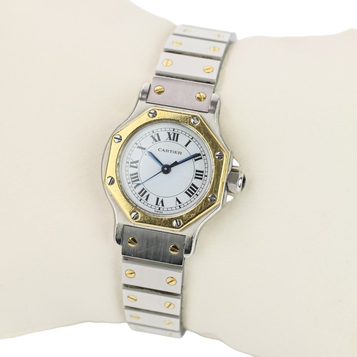 Pre-Owned Cartier Santos Octagon SM Yellow Gold Two-tone Automatic Watch with White Roman Dial for Women