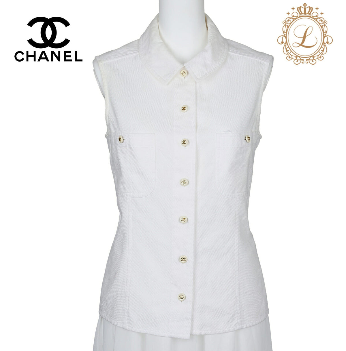 Don’t miss the opportunity to own this stunning item. Add the CHANEL Coco Button Sleeveless Shirt to your collection today and embrace the elegance of a true fashion icon!