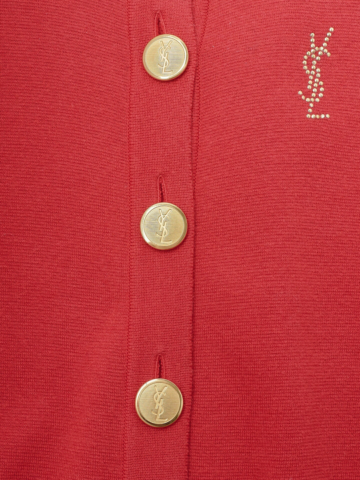 Crafted from a premium blend of 55% cotton and 45% rayon, this cardigan offers a soft and breathable fit, perfect for layering or wearing solo. The stunning red color adds a vibrant pop to your ensemble, while the iconic SAINT LAURENT logo button detail showcases your impeccable taste in high-end fashion.