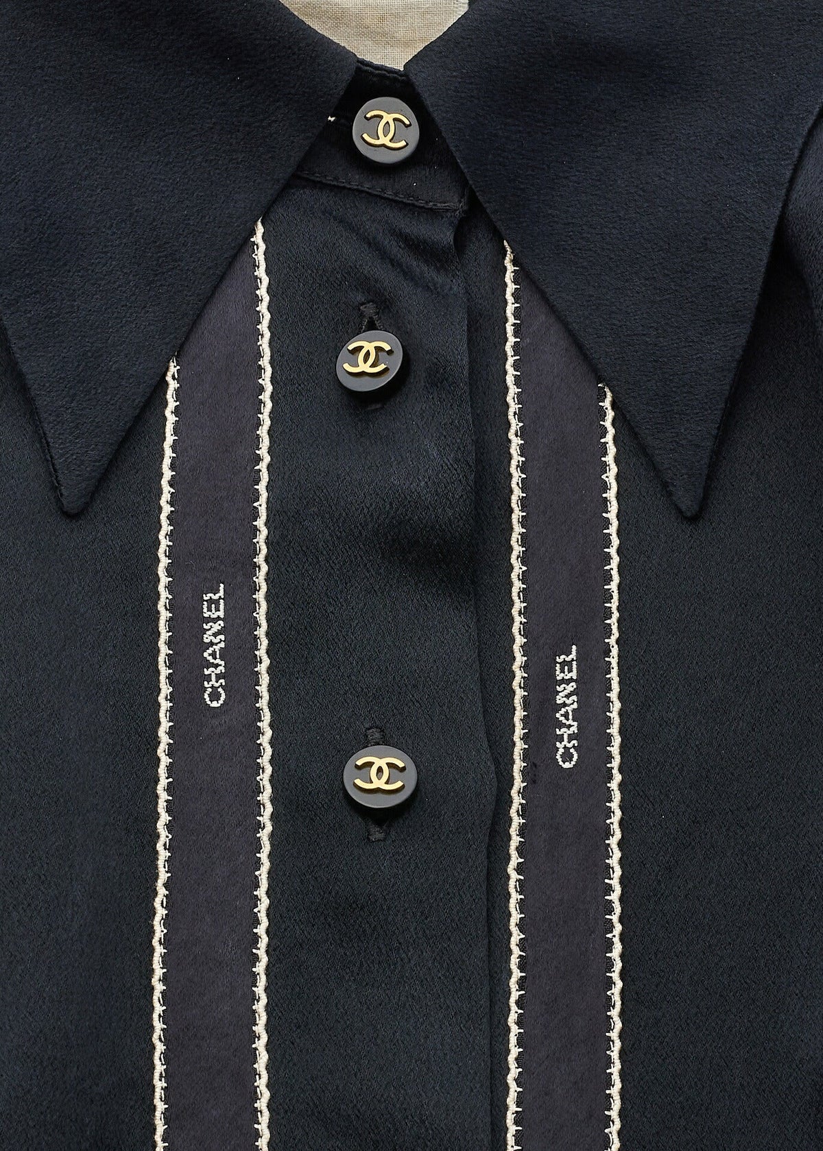 Featuring the iconic CHANEL logo ribbon design, this blouse not only showcases a timeless aesthetic but also ensures you stand out with elegance. The versatile black color complements any outfit, transitioning seamlessly from day to night.